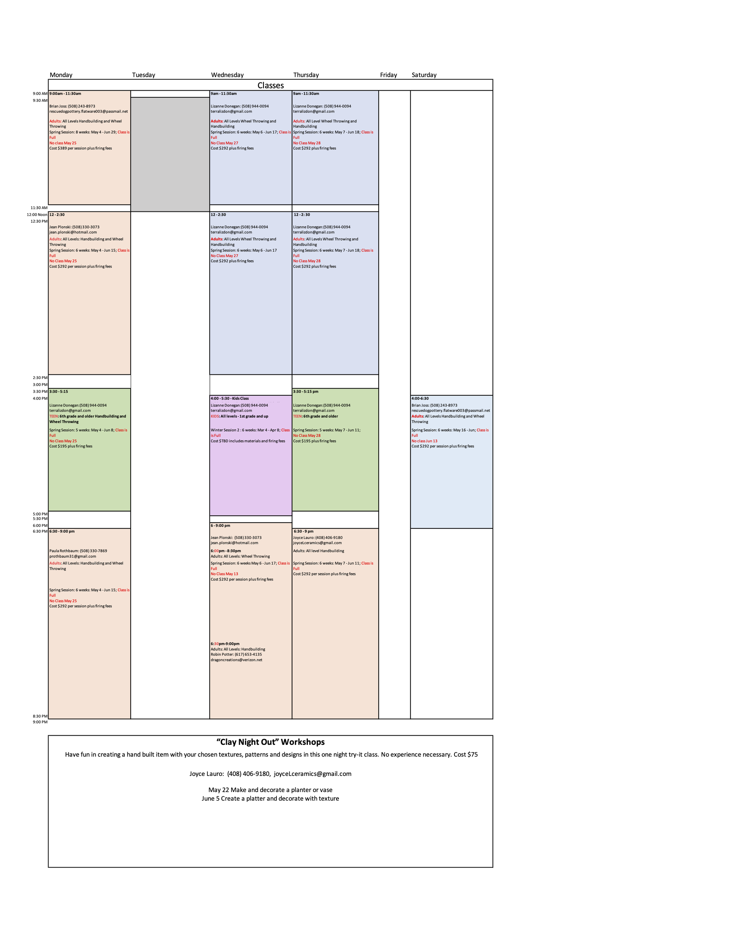 Acceptance into classes is on a first come basis with priority given to returning students. Spots are not held until payment and registration are received. Download and complete a registration form for your specific class and mail it with check made payable to your instructor to Potters Place, 6 Merchant Street, Unit #1, Sharon MA, 02067.