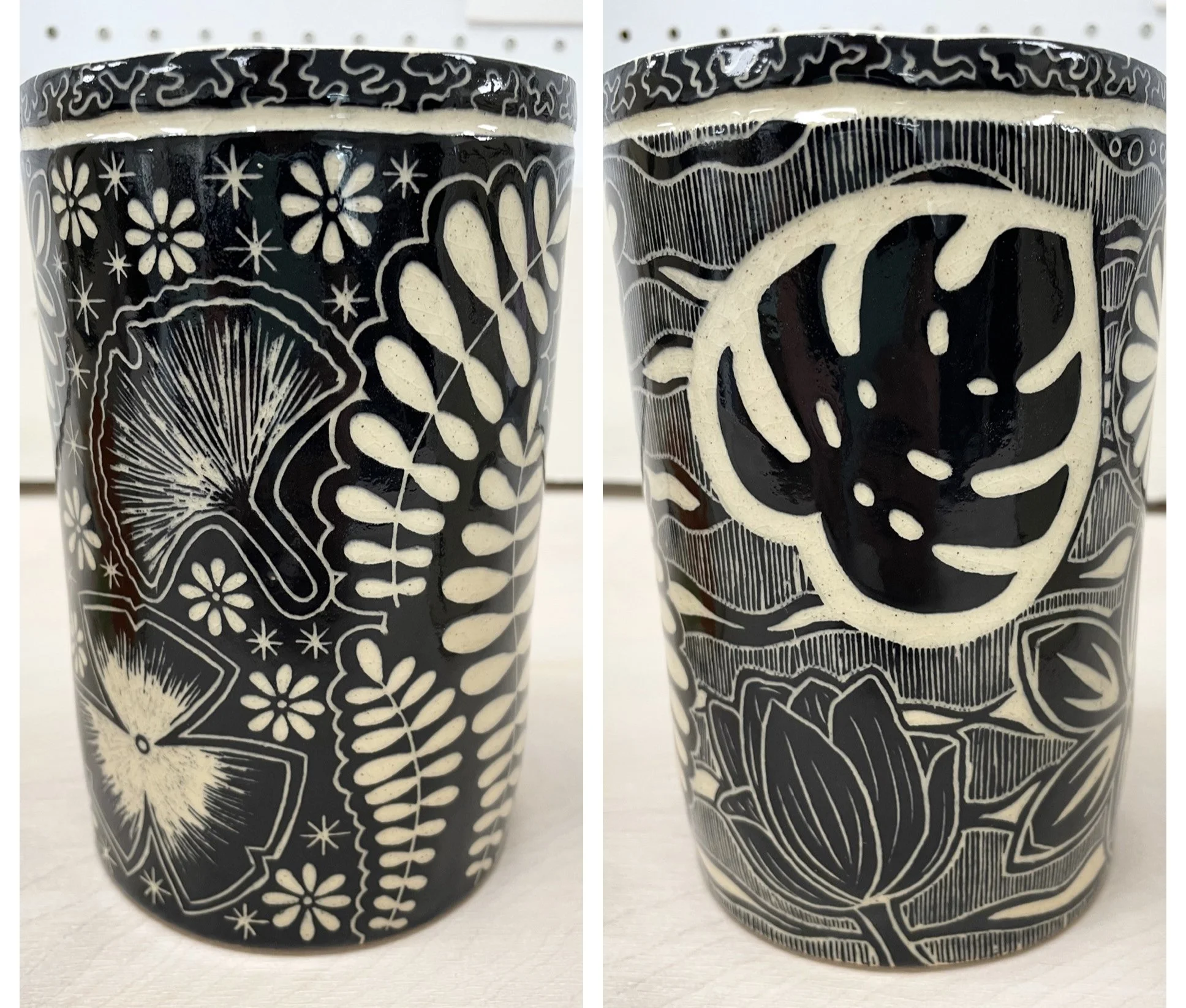 I always find surface decoration to be the most rewarding part of creating a piece. I'm not usually one to just glaze a piece and be done. I want it to be carved or have a sgraffito design. I sometimes paint floral patterns or other nature-inspired scenes on my pieces with underglaze. I feel that the surface decoration is what makes a piece beautiful and unique.