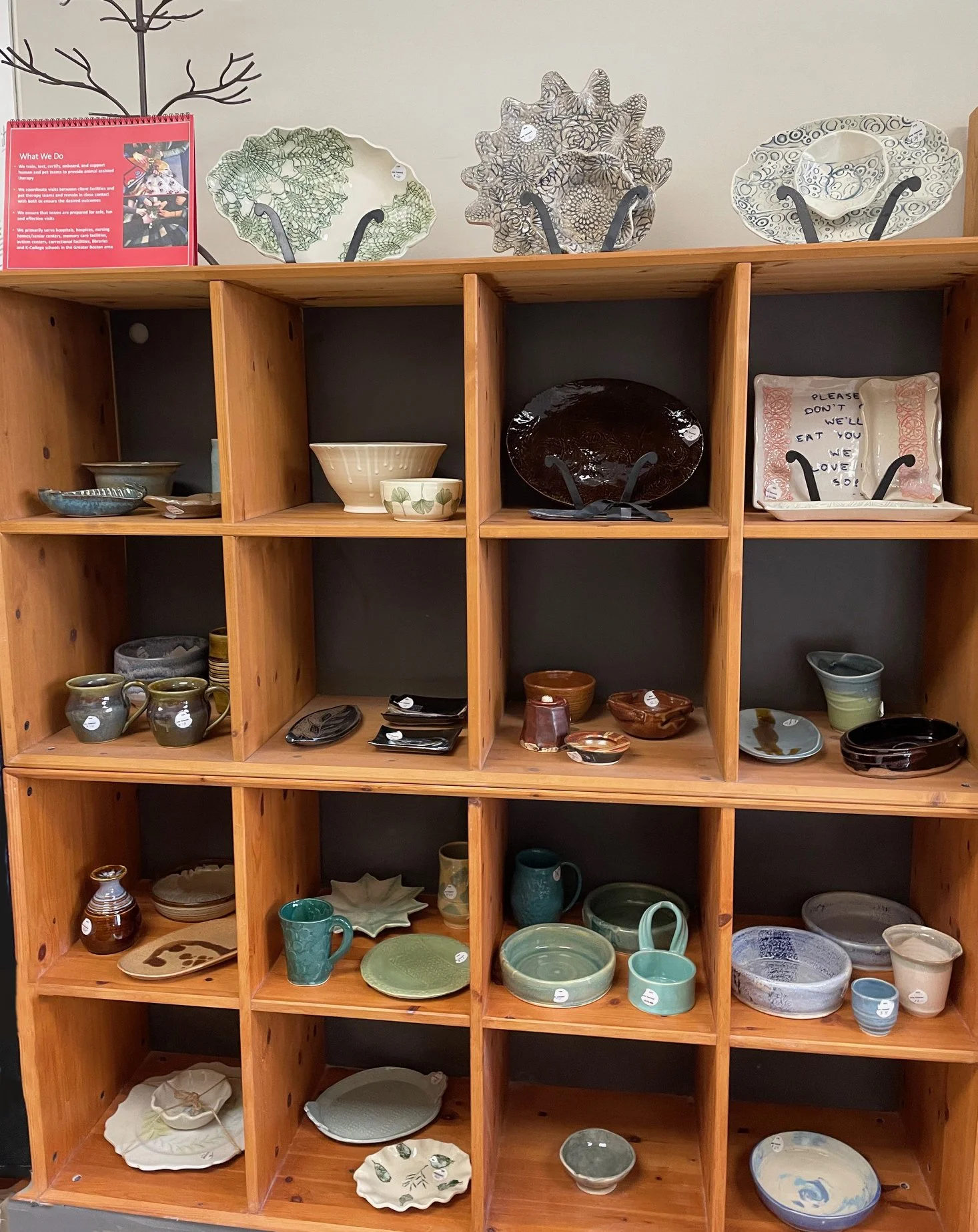 Table of member-donated pottery that was sold for the benefit of Gilly’s House.